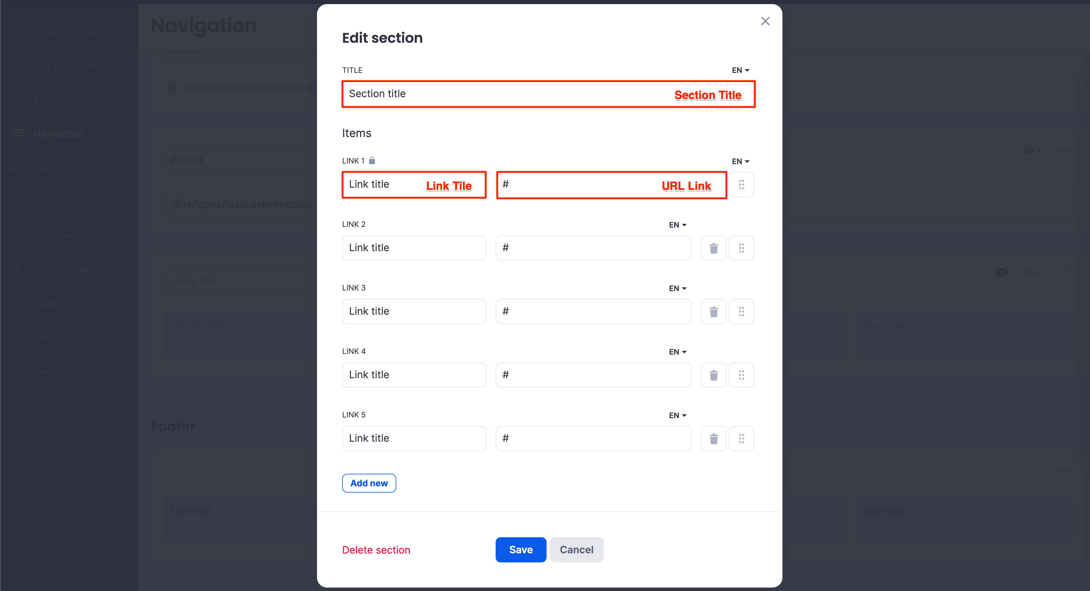 - Add / Delete navigation nodes and sections
