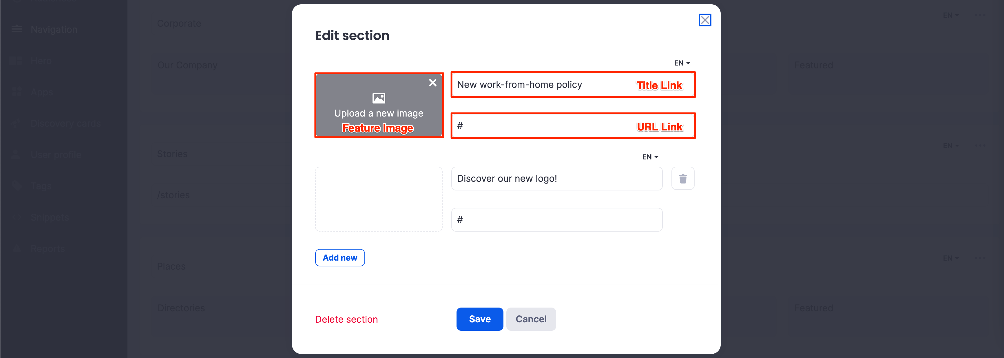 - You may add an additional featured link by clicking the Add new button, or delete a feature link by clicking the trash ๐ icon.