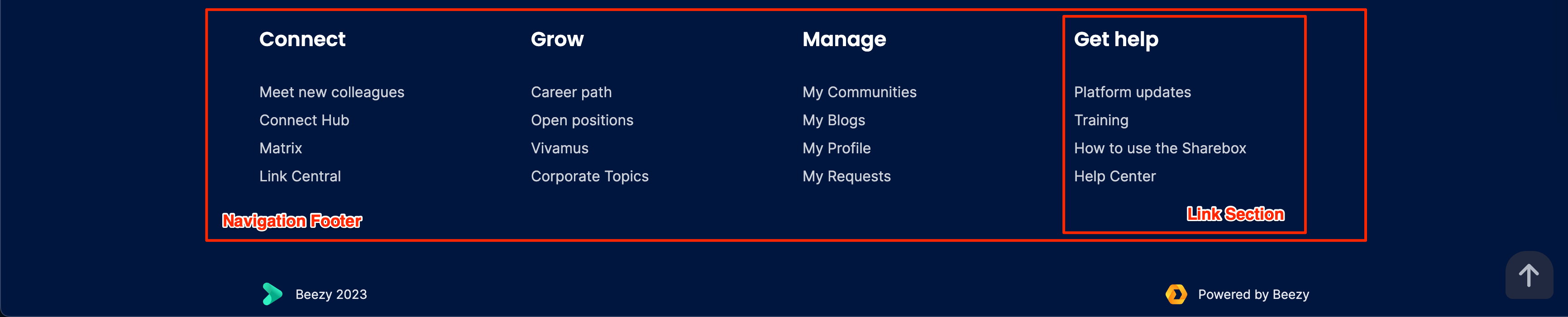 Admins may configure the navigational layout of the Navigation Footer menu that is displayed at the bottom of the Intranet platform. Only one navigational node, with a maximum of 4 sections, may be added to the menu. Additionally, the Navigation Footer may be customized with the following features: