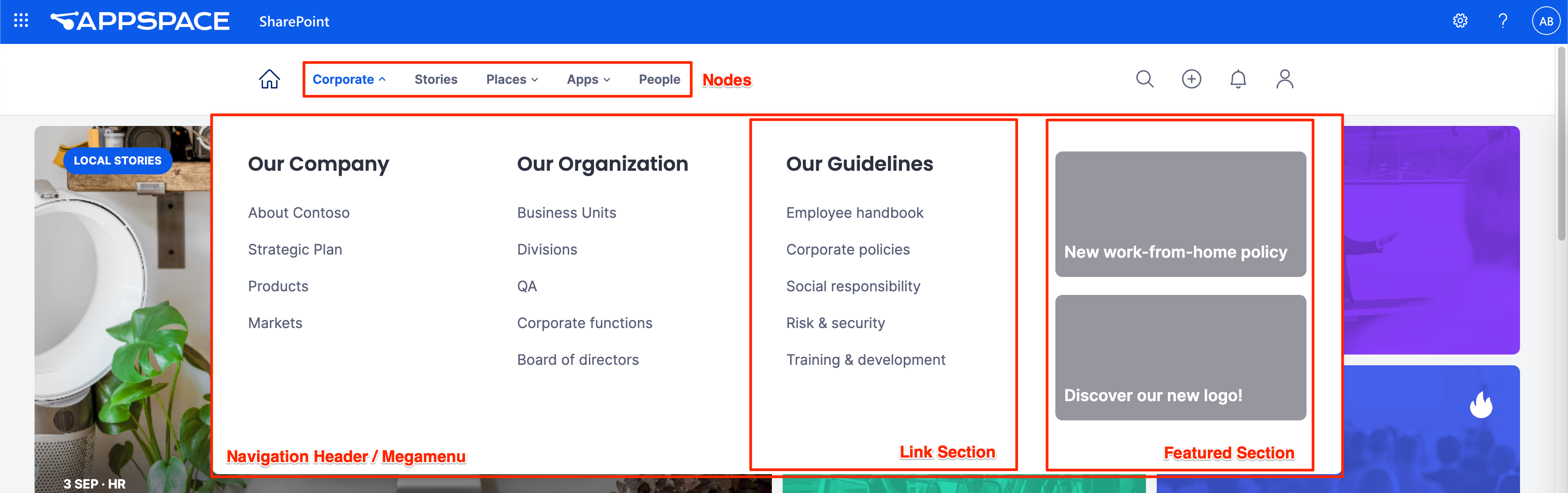 This article provides instructions to configure and manage the Megamenu header and footer navigation available on the Appspace SharePoint Intranet .
