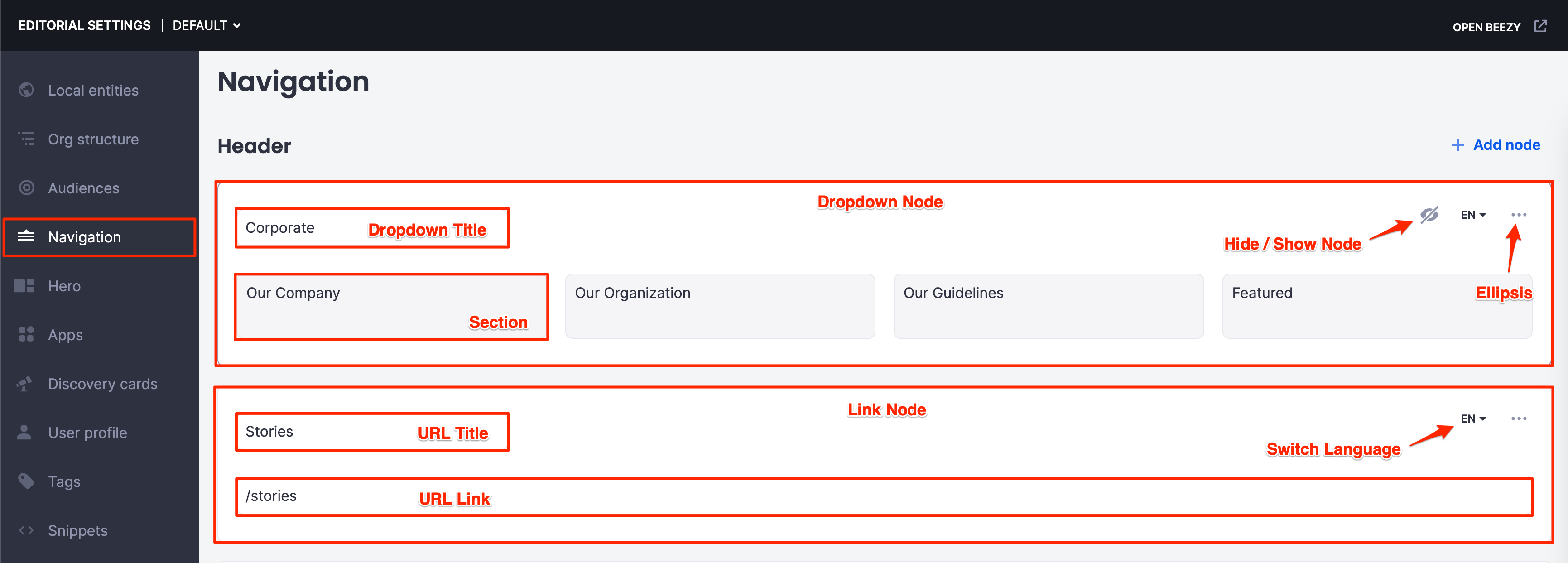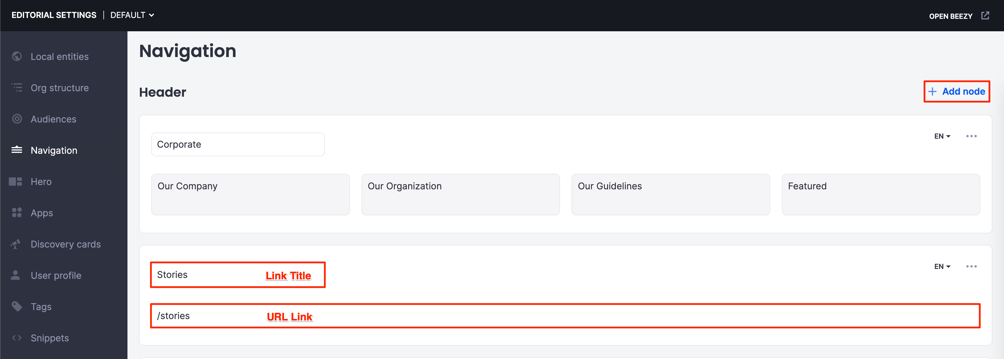 - In the Navigation Header section, click + Add node.
