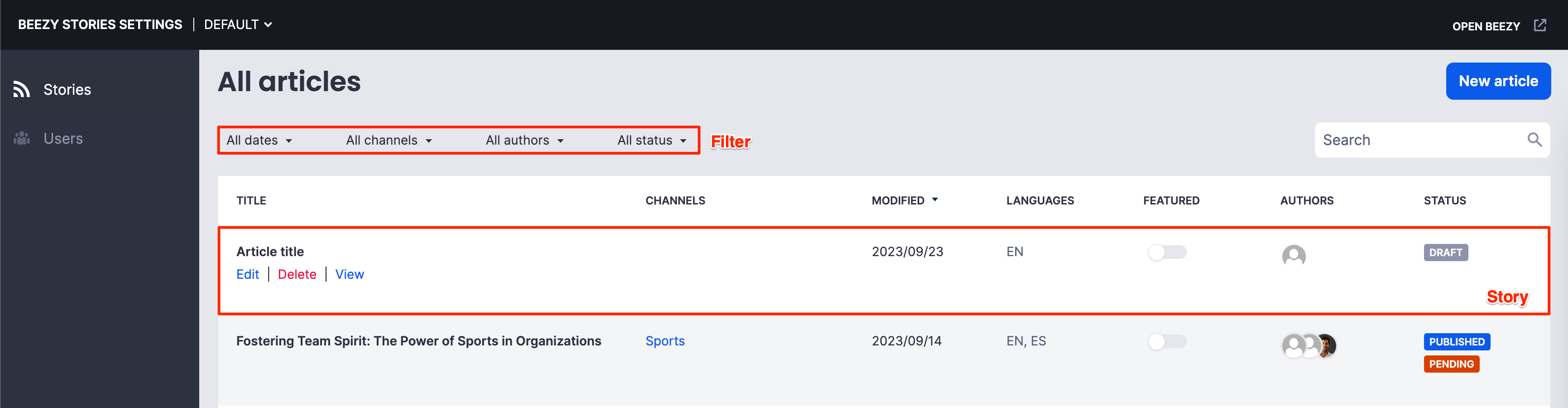 3. In the Beezy Stories Settings page, click the New article button to create a new story;