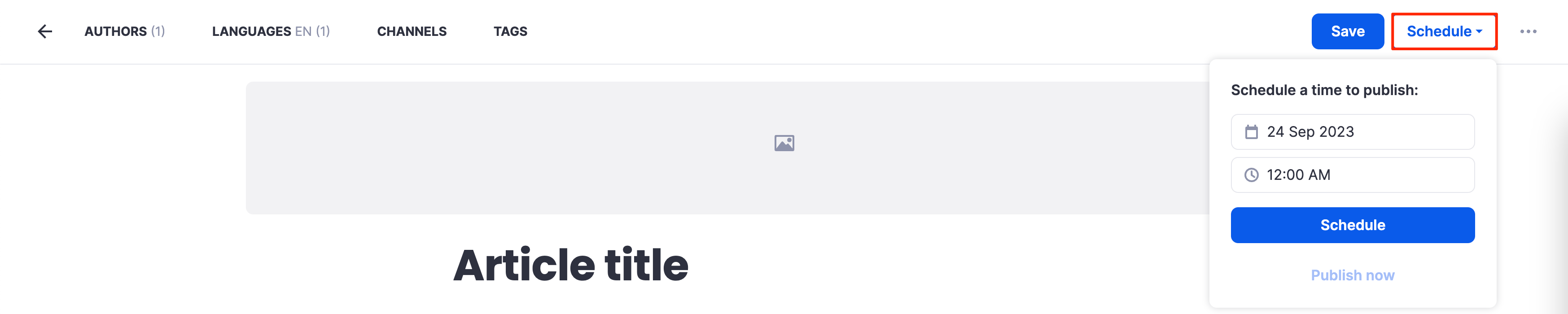 9. Click the Schedule button to schedule a time to publish the article, or click Publish now to immediately publish the article to the intranet platform.